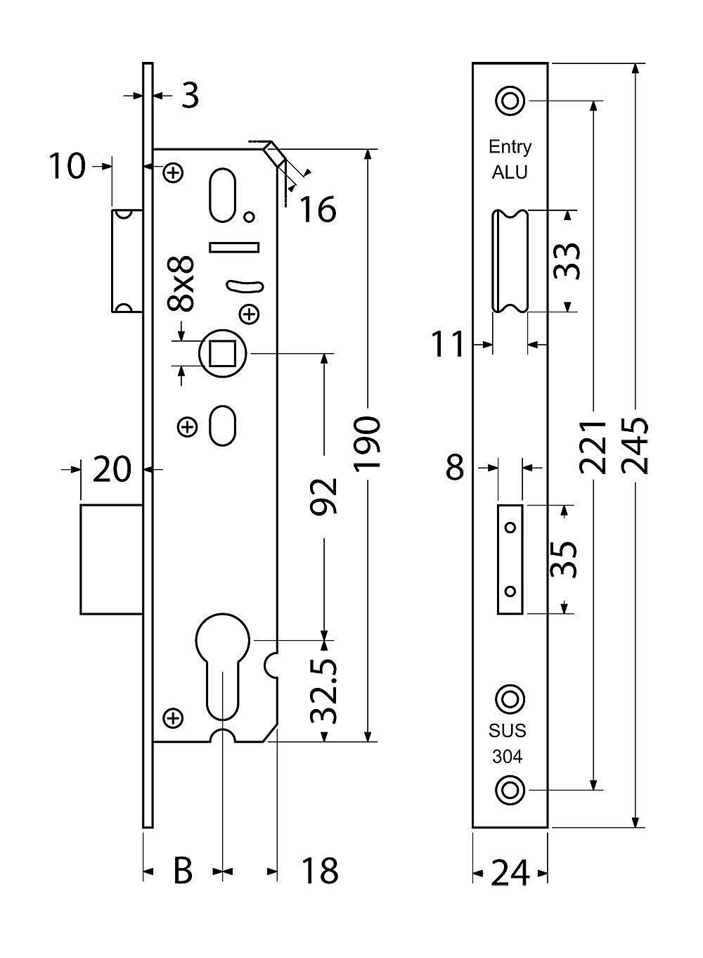 Einsteckschloss für Aluminiumtüren.