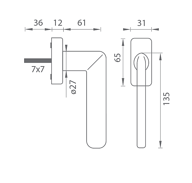 Der Griff für ein Eurofenster mit quadratischer Rosette ist aus hochwertigen Materialien – Zamak – gefertigt und hat eine Oberflächenveredelung. Die Rosette hat die Maße 31 mm x 65 mm und eine Dicke von 11 mm.