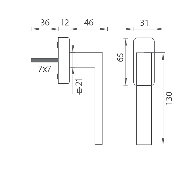 Der Euro-Fenstergriff mit quadratischer Rosette besteht aus hochwertigem Zamak-Material und ist oberflächenbehandelt. Die Rosette hat die Abmessungen 31 mm x 65 mm und eine Dicke von 11 mm.