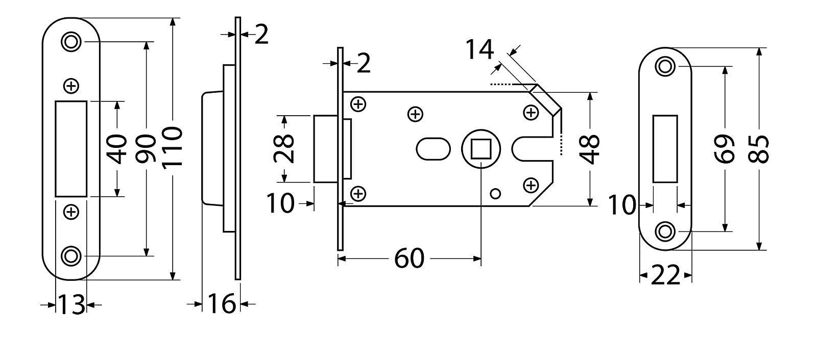 Magnet-Einsteckschloss RICHTER für Beschläge ohne Bodenrosetten EN.305.M.KL.60.22. (CE - schwarz matt)