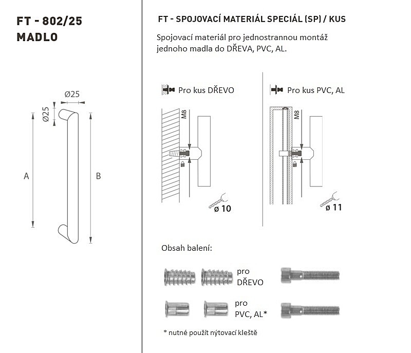 Der Türgriff besteht aus hochwertigem Edelstahl, bekannt als Edelstahl, und ist oberflächenbehandelt. Das Griffprofil ist 25 mm breit. Das SPEZIAL-Set (SP) enthält Befestigungselemente für die einseitige Montage eines Griffs in Holz, PVC oder Aluminium.