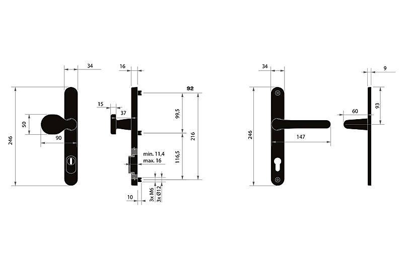 Bei Sicherheitsbeschlägen ist der Abstand zwischen der Drückerachse und der Schlüsselachse (Teilung) zu kennen. Der Standardabstand beträgt 72, 90 oder 92 mm. Die Beschläge sind standardmäßig für Türstärken von 65 bis 75 mm geeignet.