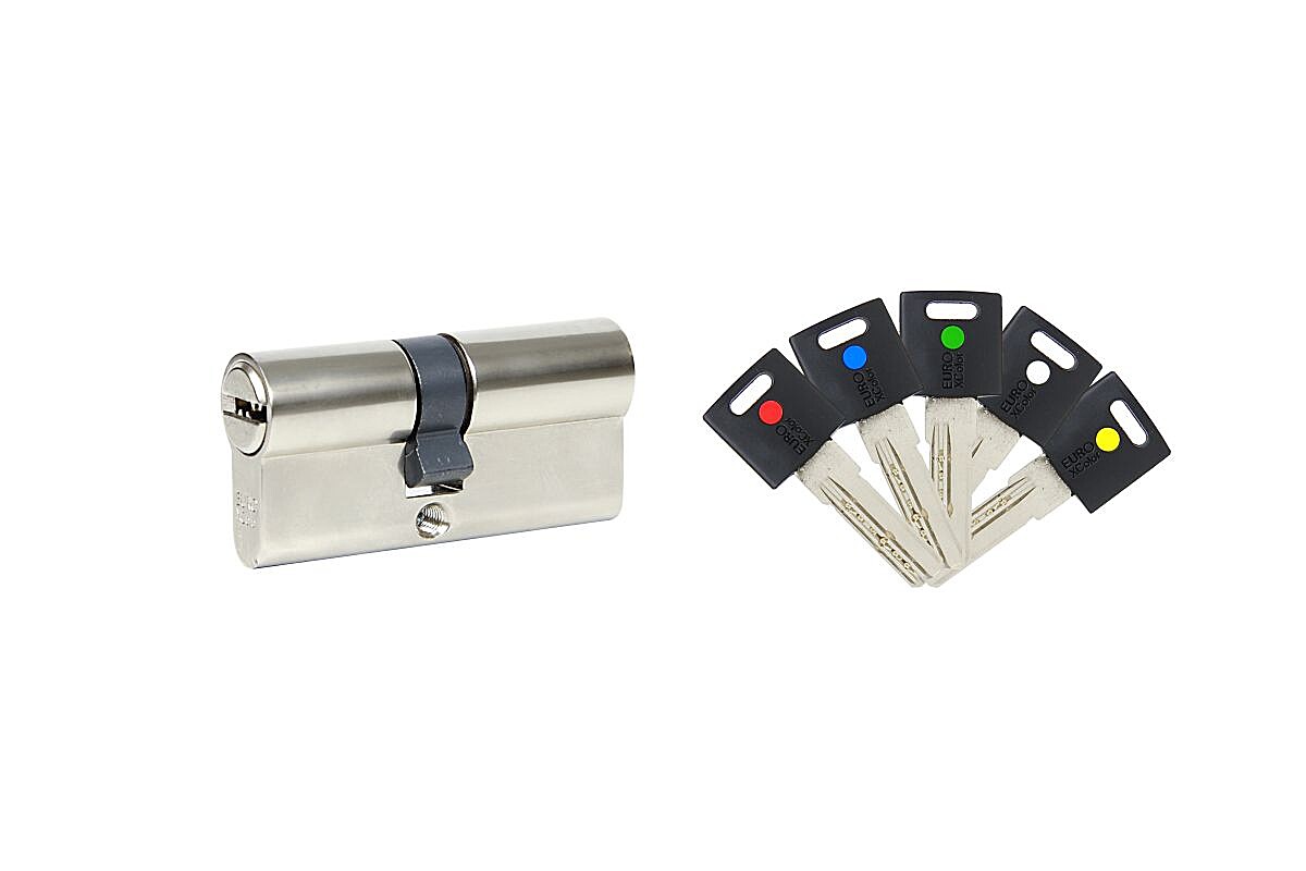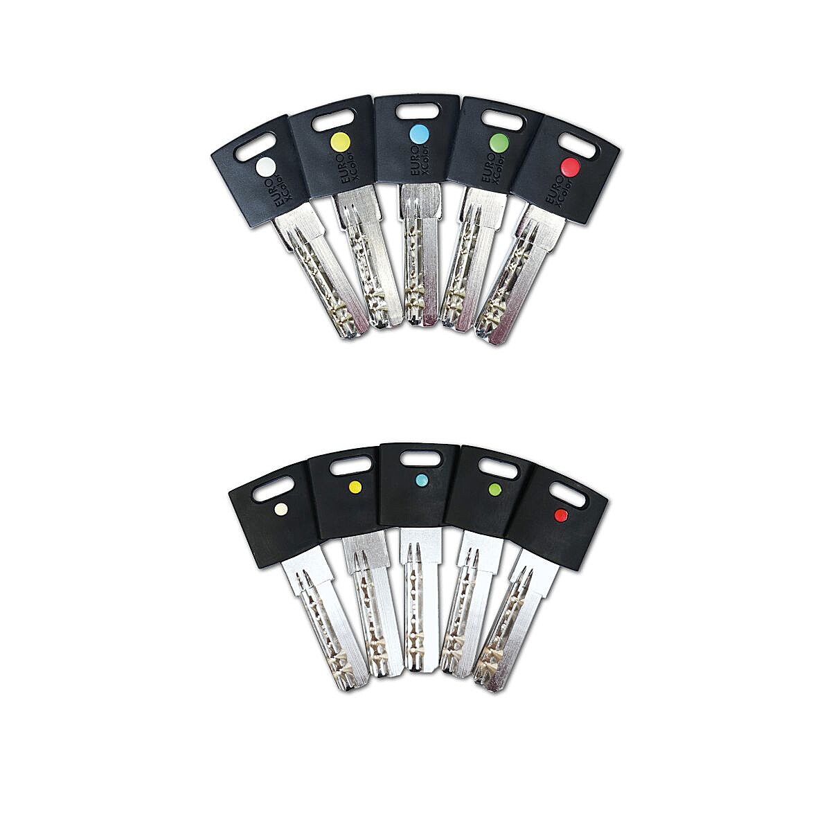 Die zugehörigen Schlüssel jedes Zylinders enthalten immer 5 verschiedene Stiftfarben: rot (CRV), blau (MOD), grün (ZEL), gelb (ZLU), weiß (BIL).