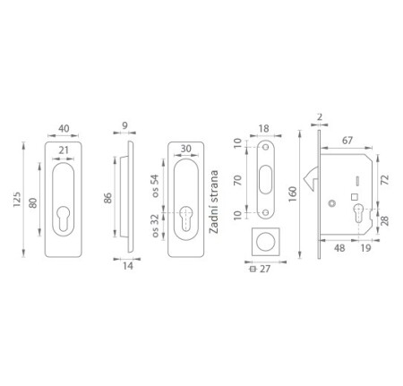 Quadratischer Satz für Schiebetüren mit einer Bohrung für einen Zylindereinsatz (PZ).