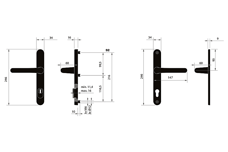 Der Beschlag wird mit drei Sicherheitsschrauben gesichert, wobei die mittlere Schraube unter der Abdeckung verborgen ist. Das Modell wird mit einem Abstand von 92 mm geliefert.