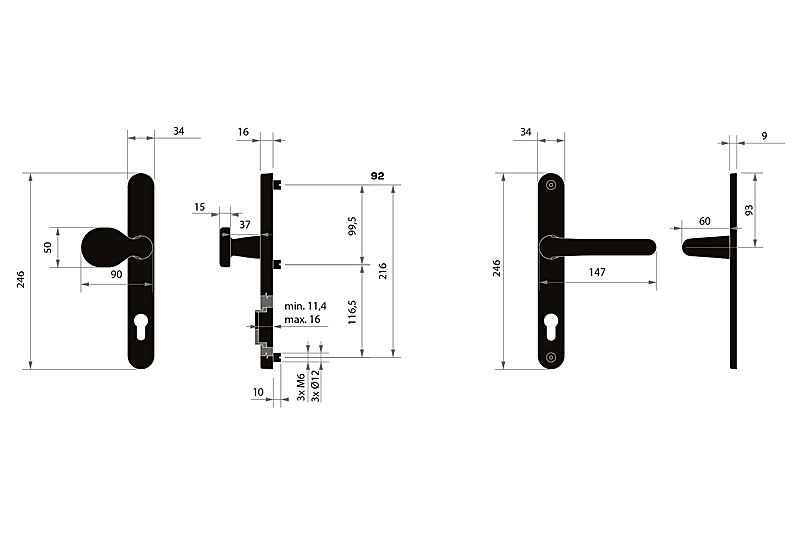 Bei Sicherheitsbeschlägen ist der Abstand zwischen der Drückerachse und der Schlüsselachse (Teilung) zu kennen. Der Standardabstand beträgt 72, 90 oder 92 mm. Die Beschläge sind standardmäßig für Türstärken von 65 bis 75 mm geeignet.