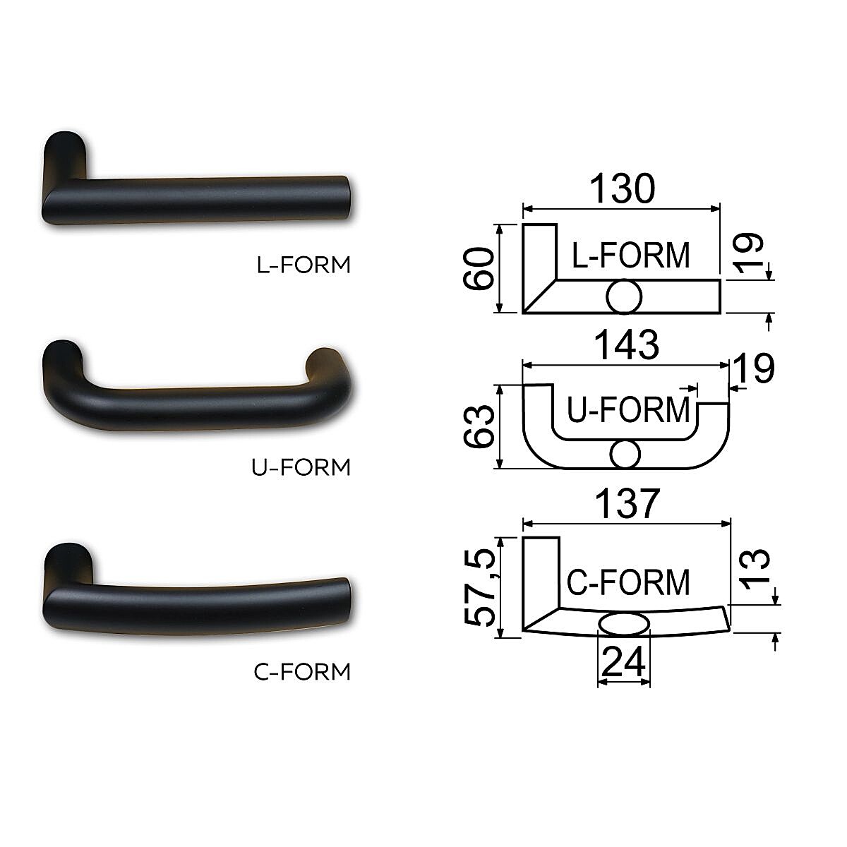 - Der Griff wird standardmäßig in der Form „C-FORM“ geliefert; auf Wunsch ist er auch in der Form „L-FORM“ oder „U-FORM“ erhältlich.