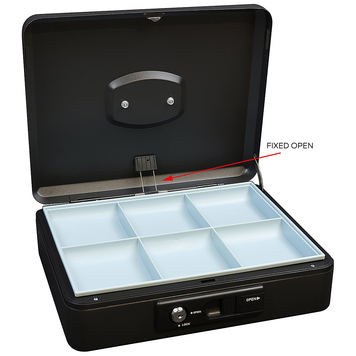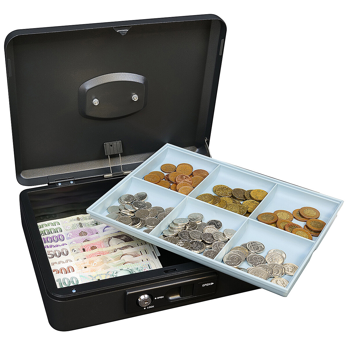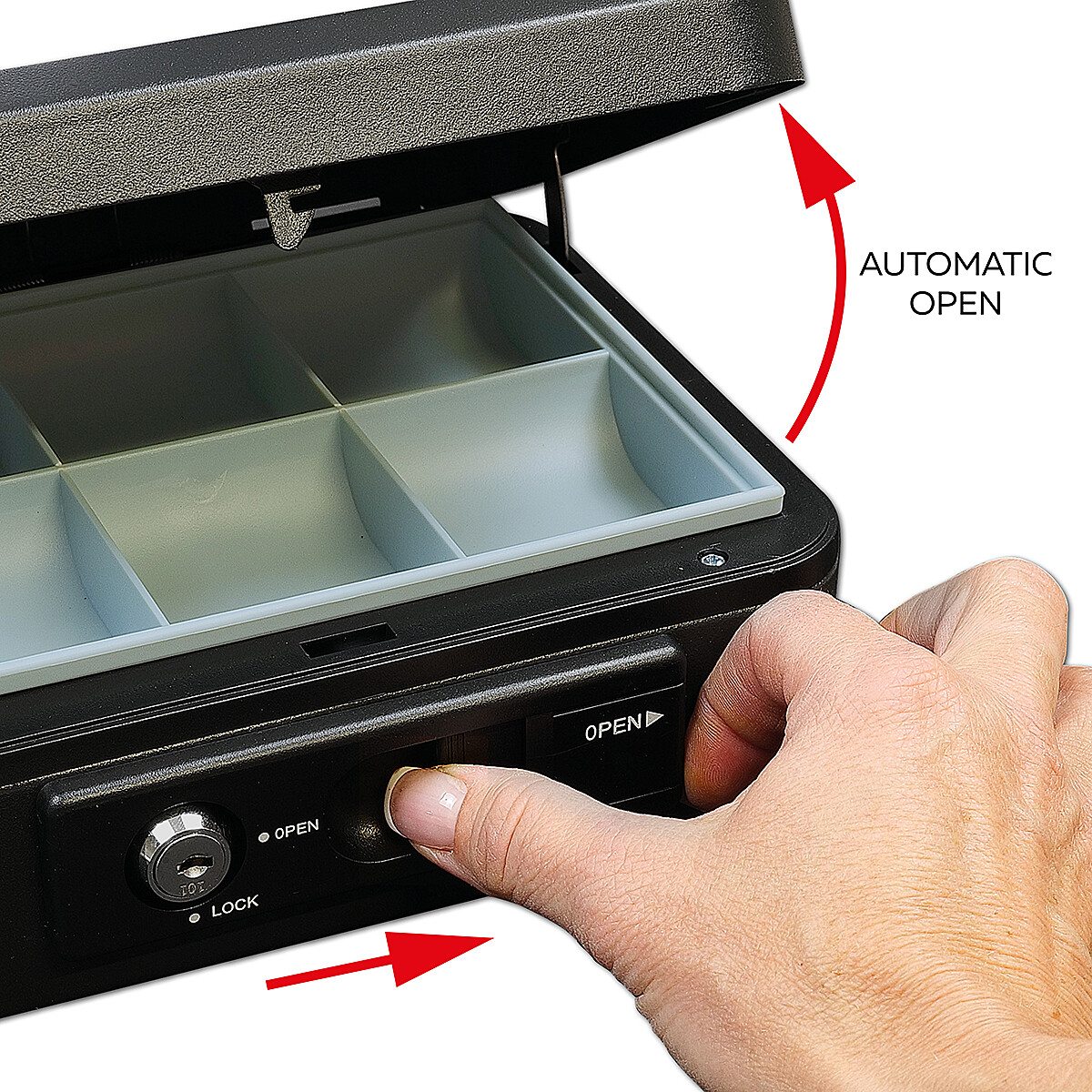 Die Spardose aus Stahl ist mit einem außenliegenden Hebel zum komfortablen automatischen Öffnen des Deckels ausgestattet. Nach dem Schließen verriegelt sich der Deckel automatisch und ermöglicht so einen sicheren Transport ohne Schlüsselschloss.