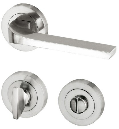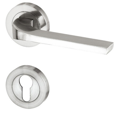 Die neue Reihe der inneren Türbeschläge mit Edelstahleffekt, geschraubte Rundrosette.