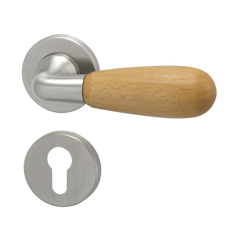 Der Türgriff WS 00 mit runder Rosette ist für die Montage im Innen- und Außenbereich geeignet, gefertigt aus Edelstahl DIN 1.4301 mit seidenmatter Oberfläche und einem Griff aus Buchenholz in modernem und zeitlosem Design, hygienisch unbedenklich, mit langer Lebensdauer . Die Oberflächenbehandlung des Edelstahlteils erfolgt durch Bürsten, es werden keine anderen Lacke darauf aufgetragen oder Oberflächenbehandlungen durchgeführt.