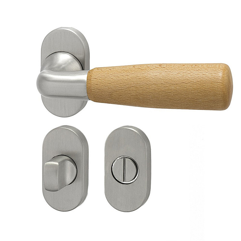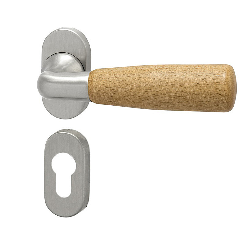 Der Türgriff WS 01 mit ovaler Rosette ist für die Montage im Innen- und Außenbereich geeignet, gefertigt aus Edelstahl DIN 1.4301 mit seidenmatter Oberfläche und einem Griff aus Buchenholz in modernem und zeitlosem Design, hygienisch unbedenklich, mit langer Lebensdauer . Die Oberflächenbehandlung des Edelstahlteils erfolgt durch Bürsten, es werden keine anderen Lacke darauf aufgetragen oder Oberflächenbehandlungen vorgenommen.