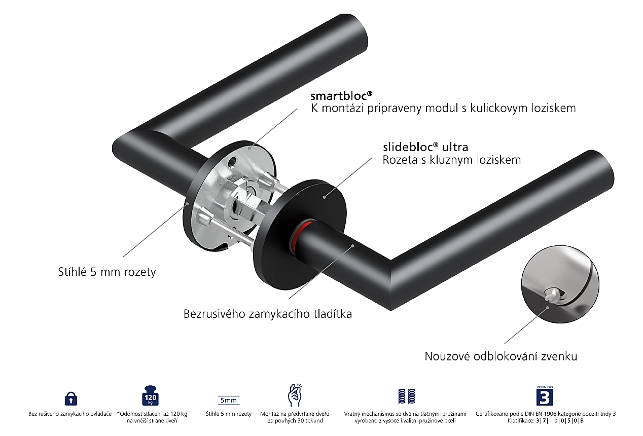 Dank der innovativen Fallenschlossfunktion bietet das smartbloc®-System eine sichere Lösung zum Verriegeln von Türen, ohne dass ein herkömmliches Schloss verwendet werden muss. Dieses einzigartige System ermöglicht ein einfaches und schnelles Verriegeln der Tür durch Drücken des Griffs und sorgt so für zusätzliche Sicherheit. Diese benutzerfreundliche Funktion ist besonders praktisch in Räumen, in denen Privatsphäre oder Sicherheit regelmäßig und kurzfristig erforderlich sind.