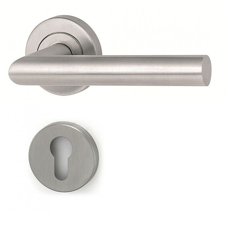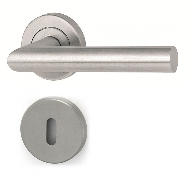 Der Türgriff MT 00 mit runder, quadratischer oder ovaler Rosette eignet sich für die Montage im Innen- und Außenbereich, ist aus Edelstahl DIN 1.4301 mit seidenmatter Oberfläche gefertigt, zeichnet sich durch ein modernes und zeitloses Design aus, ist hygienisch unbedenklich und langlebig.