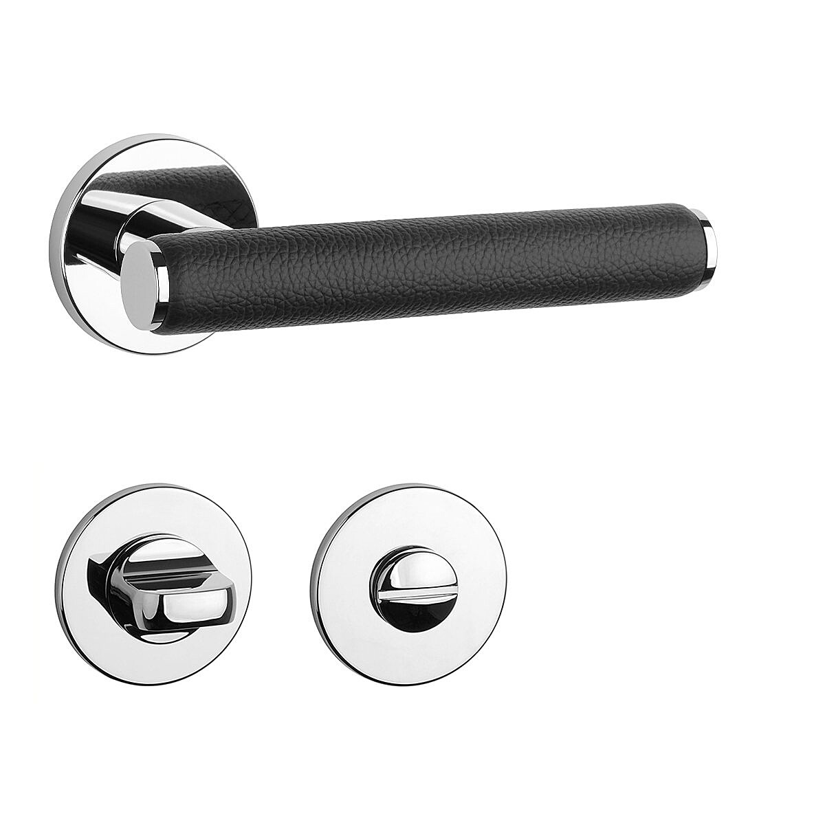 Der Rosettengriff für Innentüren mit runder Rosette besteht aus hochwertigen Materialien – Zamak und ist oberflächenbehandelt. Ein interessantes Element ist das schwarze Leder, das den Griff des Griffs umgibt.