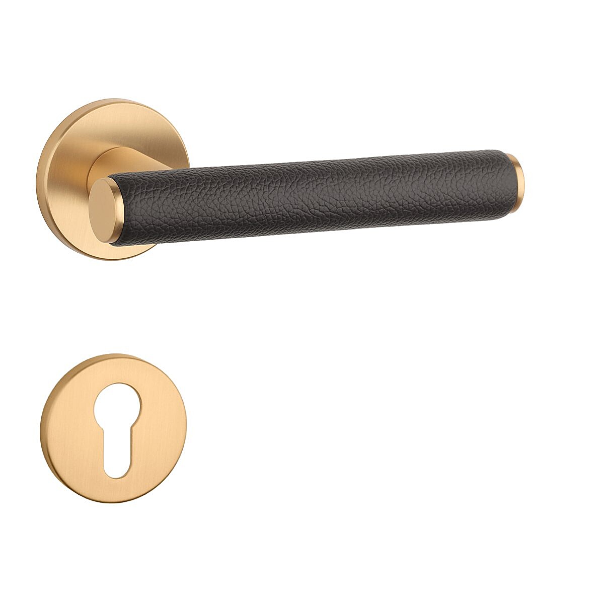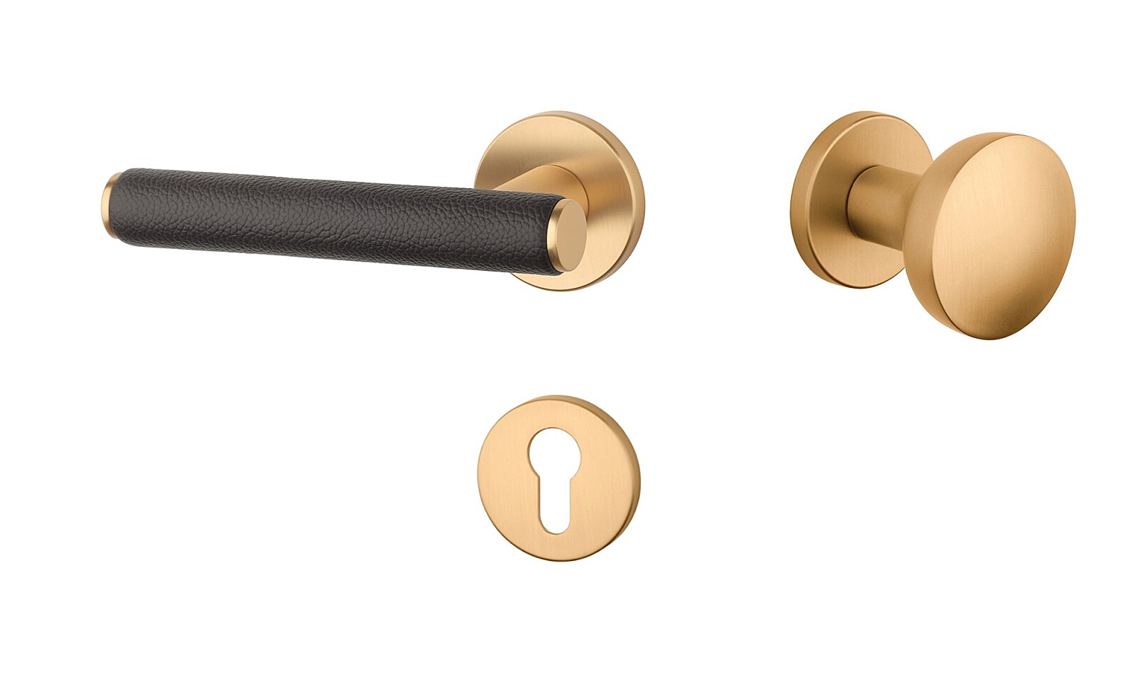 Der Rosettengriff für Innentüren mit runder Rosette besteht aus hochwertigen Materialien – Zamak und ist oberflächenbehandelt. Ein interessantes Element ist das braune Leder, das den Griff des Griffs umgibt.