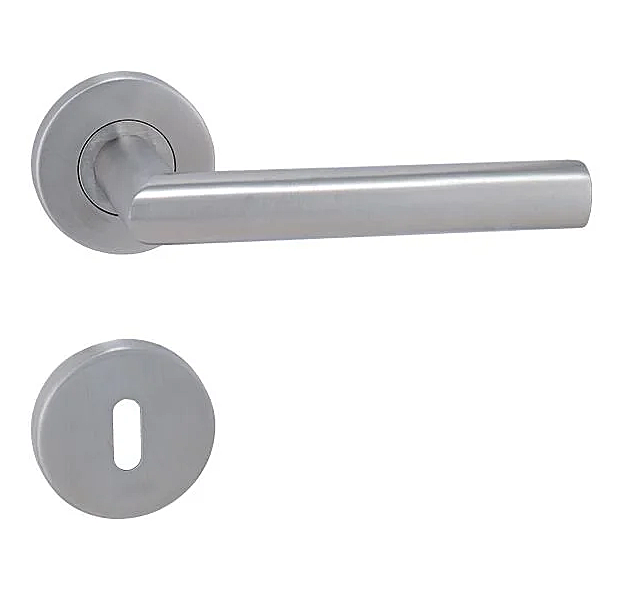 Rosettengriff an einer Innentür mit runder Rosette aus hochwertigem Edelstahl, sogenanntem Edelstahl, und oberflächenbehandelt. Die Rosette hat einen Durchmesser von 54 mm und eine Dicke von 9 mm. Es ist farbstabil und verschleißfest. Die Armatur wurde gemäß der Norm ČSN EN 1906:2012 auf 200.000 Zyklen getestet.