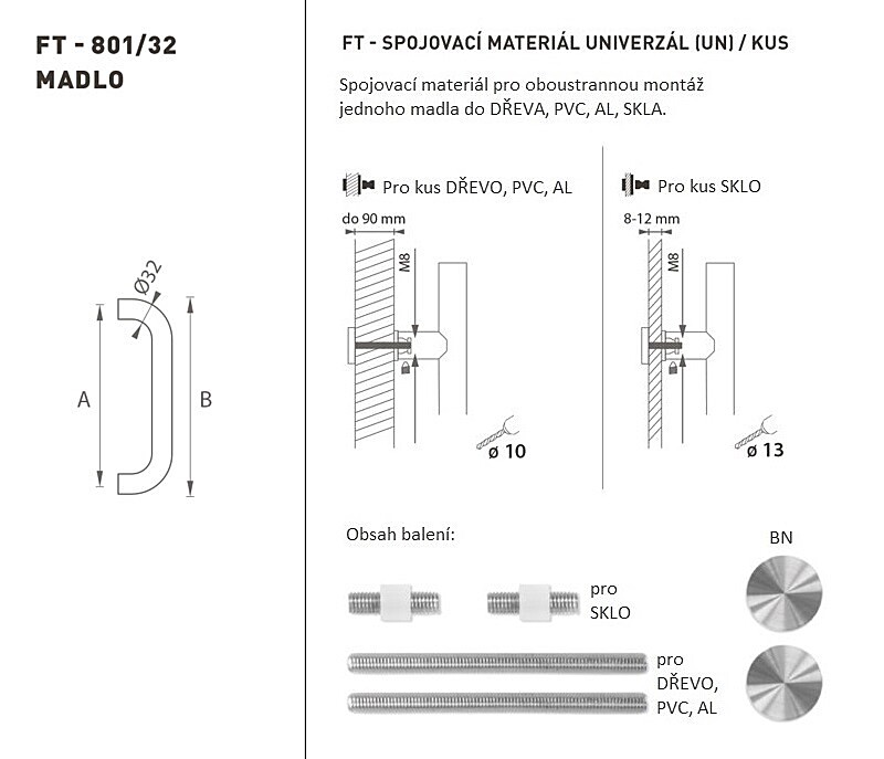 Der Türgriff besteht aus hochwertigem Edelstahl, dem sogenannten Edelstahl, und ist oberflächenbehandelt. Das Griffprofil beträgt Ø 32 mm. Das Set UNIVERSAL (UN) enthält Befestigungselemente zur beidseitigen Montage eines Griffs aus Holz, PVC, AL, Glas.