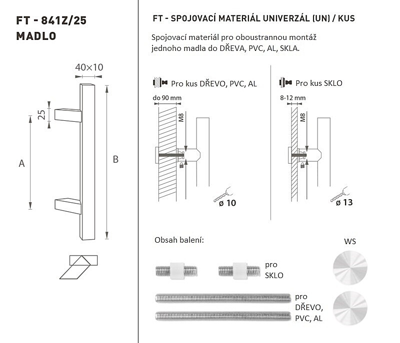 Der Türgriff besteht aus hochwertigem Edelstahl, dem sogenannten Edelstahl, und ist oberflächenbehandelt. Das Griffprofil beträgt 40 x 10 mm. Das Set UNIVERSAL (UN) enthält Befestigungselemente zur beidseitigen Montage eines Griffs aus Holz, PVC, AL, Glas.