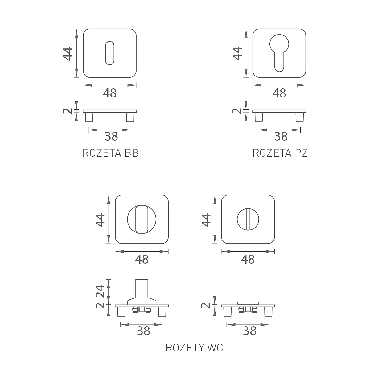 Die Rosette hat die Abmessungen 48 mm x 44 mm, eine Dicke von 2 mm und ein ovales Loch für einen Innenschlüssel (BB), ein Loch für einen Zylindereinsatz (PZ) oder ein WC-Set mit eingebautem Schlüssel.