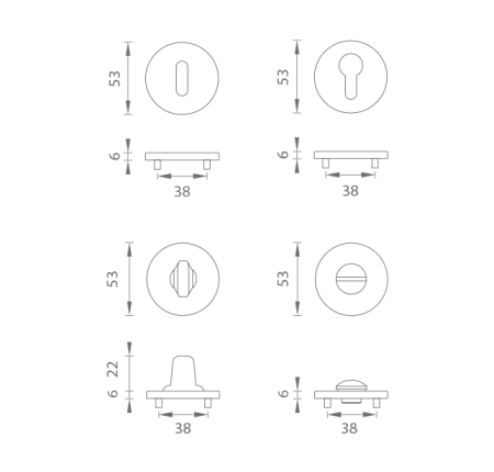 Die runde Rosette besteht aus hochwertigen Materialien - Zamak und ist oberflächenbehandelt. Die Rosette hat einen Durchmesser von 52 mm, eine Dicke von 7 mm und ein ovales Loch für einen Innenschlüssel (BB), ein Loch für einen Zylindereinsatz (PZ), eine Toilettengarnitur mit eingebautem Schlüssel. Die Packung enthält 2 Stück Rosetten (ein Paar) und die Toilettenrosetten sind als Set in der Packung enthalten.