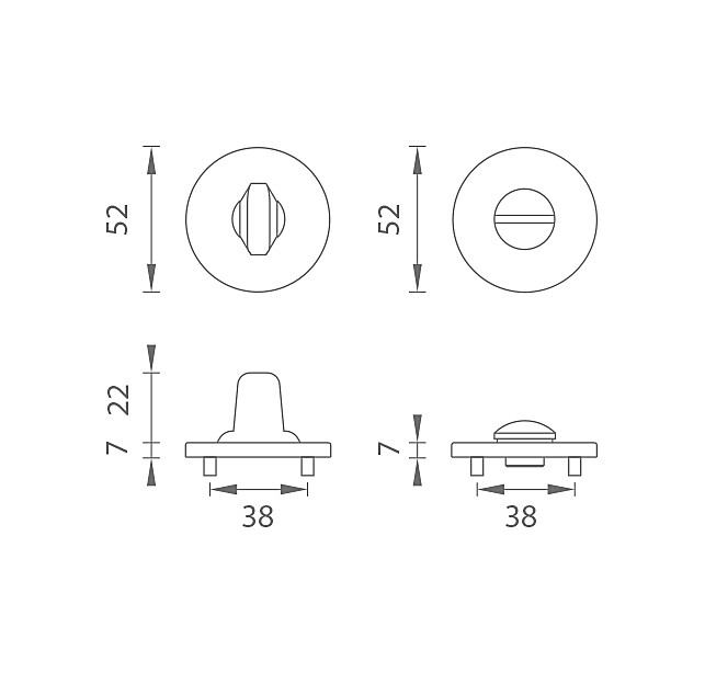 Die runde Rosette besteht aus hochwertigen Materialien - Zamak und ist oberflächenbehandelt. Die Rosette hat einen Durchmesser von 52 mm, eine Dicke von 7 mm und ein ovales Loch für einen Innenschlüssel (BB), ein Loch für einen Zylindereinsatz (PZ), eine Toilettengarnitur mit eingebautem Schlüssel. Die Packung enthält 2 Stück Rosetten (ein Paar) und die Toilettenrosetten sind als Set in der Packung enthalten.