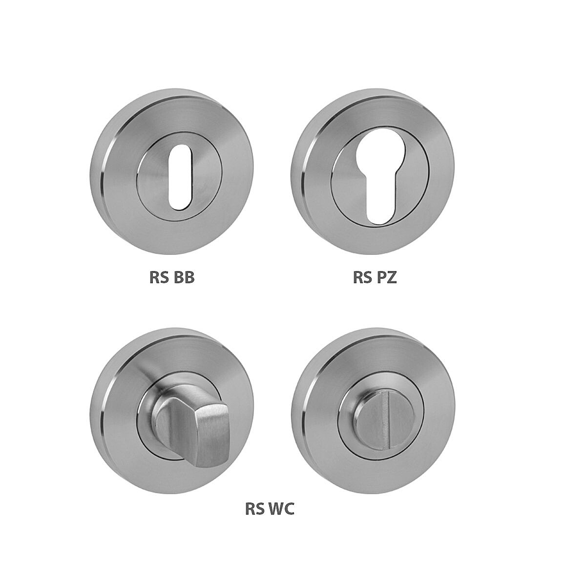Die Rosette verfügt über eine ovale Bohrung für einen Innenschlüssel (BB), eine Bohrung für einen Zylindereinsatz (PZ) oder eine WC-Garnitur mit eingebautem Schlüssel.
