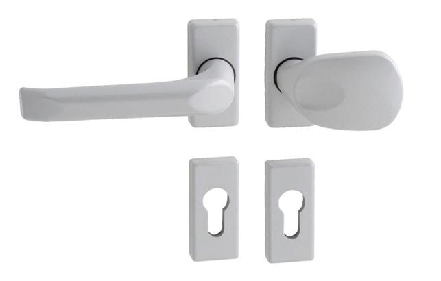 Der Rosettendrücker für Eingangs- und Sicherheitstüren mit verstärkter eckiger Schmalrosette ohne Überstand des Zylindereinsatzes ist aus Aluminium gefertigt und oberflächenveredelt.